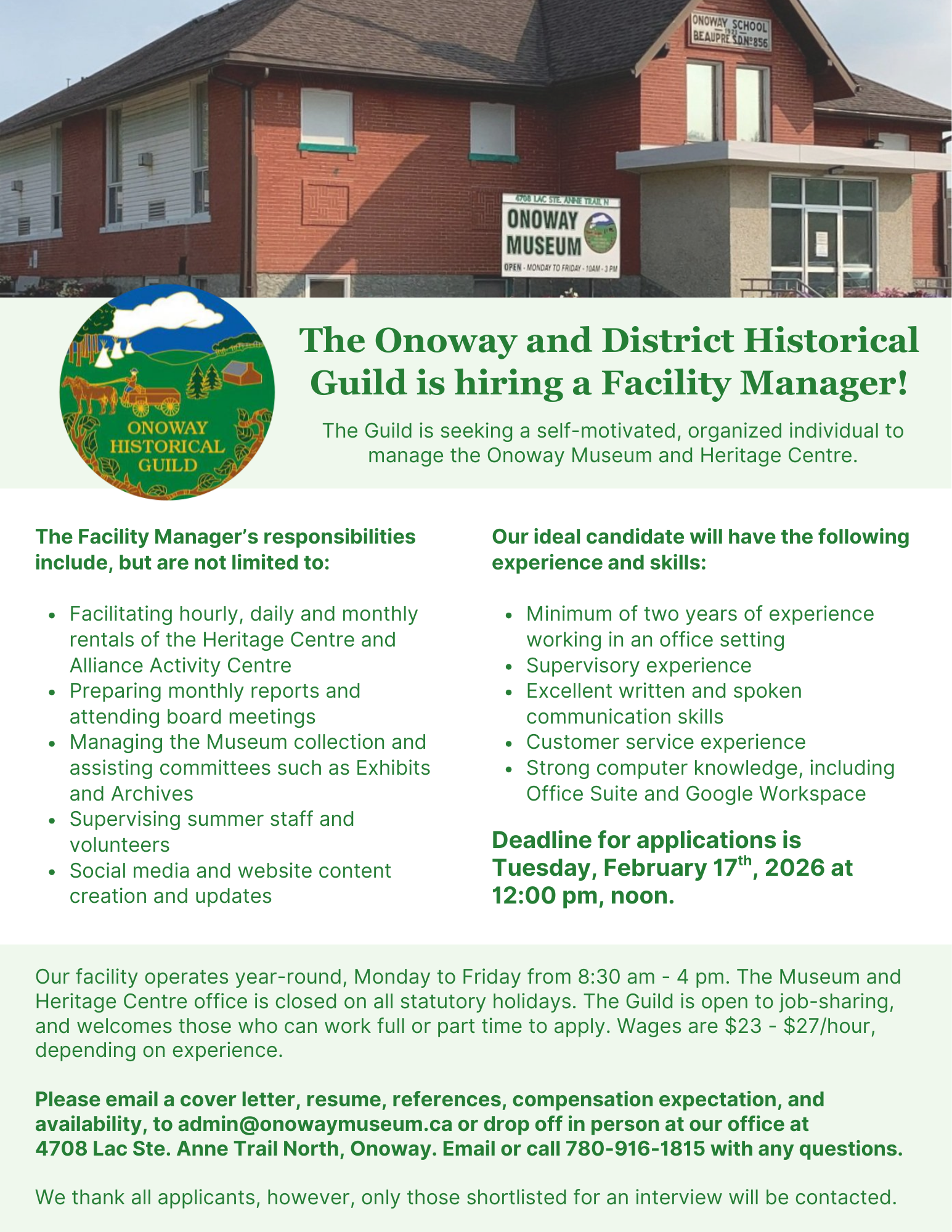 The Guild is seeking a self-motivated, organized individual to manage the Onoway Museum and Heritage Centre. Please drop off your resume and cover letter at the office or email to admin@onowaymuseum.ca by Tuesday, February 17th, at 12 pm, noon.